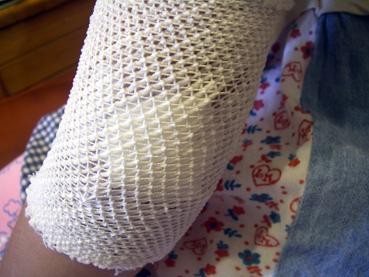 這次因為燙傷藥膏用完了,太懶惰沒去藥局買新的,先用家裡閒適的藥膏,這是之前爸比開刀塗傷口用剩下的,早上包紮直到晚上要換藥時,居然紗布緊緊粘住傷口,因為它是油性藥膏,我也塗不少呀!卻萬萬沒想到會粘住?詢問做護士的小姑如何處理,她說:邊沖生理食鹽水邊拔紗布......但還是拔不起來,咕庭痛得狂哭,我和爸比巳經狠不下心處理了,只好等隔天到外科診所讓醫生處理。